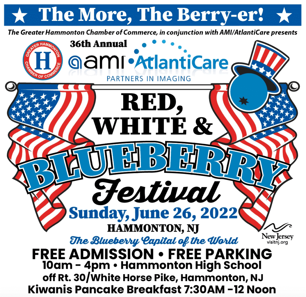 The Greater Hammonton Chamber of Commerce, in conjunction with AMI/AtlantiCare, has announced that the 36th Annual Red, White, & Blueberry Festival will be held on Sunday, June 26, 2022 at the Hammonton High School Grounds in Hammonton, New Jersey- The Blueberry Capital of the World. Learn more.
