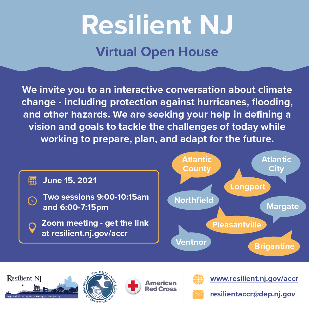 The Atlantic County Coastal Region #ResilientNJ regional resilience and adaptation action plan virtual open house meetings were held on 6/15/2021. If you were not able to join us, please see links below to access recordings of the meetings (same presentation held in morning and evening). We are asking for your help in defining a vision and goals to help tackle the challenges of today while also working to prepare for, plan, and adapt to our changing climate. Your help can be given by participating in the survey below that accompanies the meetings by JUNE 30TH. Survey participants will be given an opportunity to win a free adult First Aid/CPR course from the American Red Cross that will be raffled off randomly.