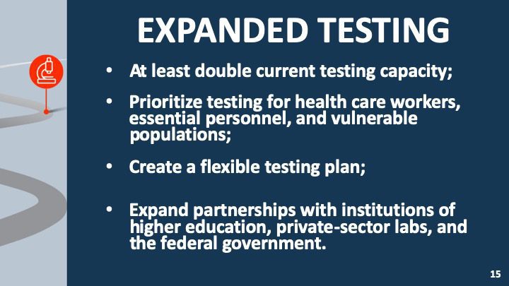 - Prioritize testing for health care workers, essential personnel, and vulnerable populations;