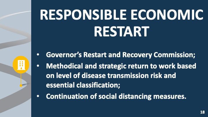 - Create the Governor’s Restart and Recovery Commission to advise on the process and recommend responsible and equitable decisions;