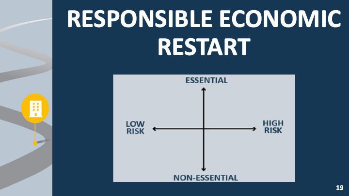 - Plan for a methodical and strategic return to work based on level of disease transmission risk and essential classification;